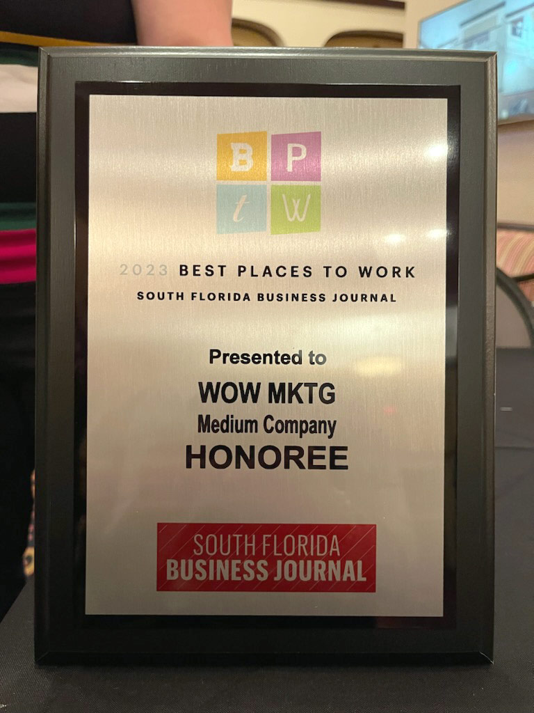 CORAL GABLES, FL. – FEBRUARY 27, 2023 – WOW MKTG, a full-service marketing, communications and events agency, was selected among the South Florida Business Journal’s (SFBJ) Best Places to Work for 2023. The agency was nominated in the medium-sized category (includes companies with 50 to 99 employees) from Miami-Dade, Broward, and Palm Beach counties. The finalists were chosen based on data collected through surveys that measured employee engagement and emotional connection to their companies.